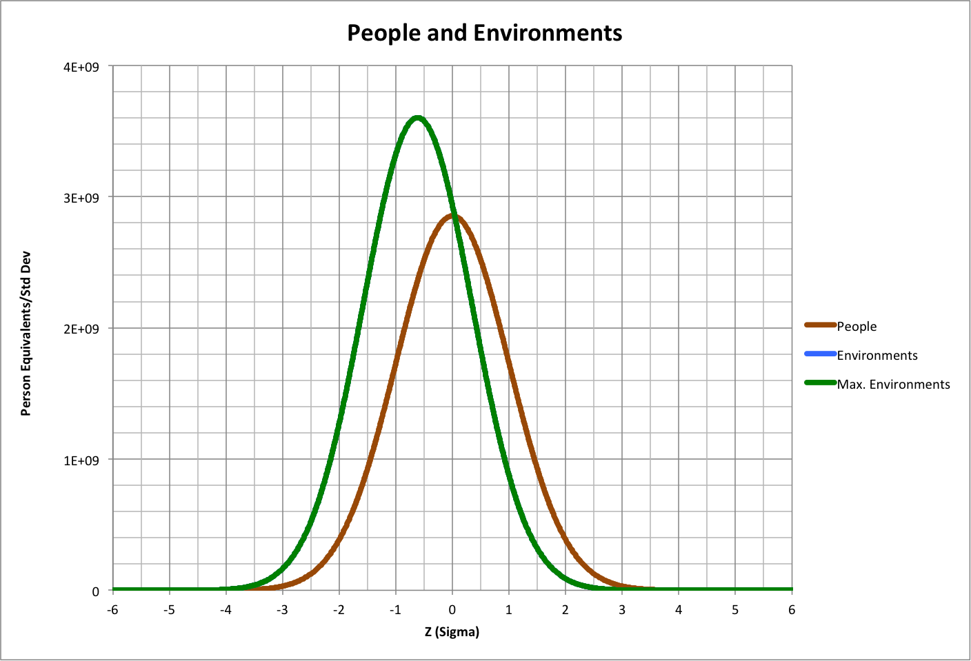 The peak may be explained by an inability to grow the number of inhabited environments, and perhaps being forced decrease in them. One mechanism is suggested by scaling the maximum environments to the Living Planet Index (LPI) using its relationship to total ecological footprint as derived in Version 3 and defined in 2010. Recall that LPI is roughly proportional to the populations of other species. Our consumption of ecological resources leaves less for other species, and also kills them outright. Based on the work in Version 3, LPI has a maximum ("LPImax") when footprint ("F") equals zero: LPI(F=0) = LPImax. The largest amount of maximum environments (also when F = 0) is the same as the number of inhabited environments when happiness is at its maximum (Epop when h = hmax). As shown in Figure A below, total environments scaled to LPI is projected to have equaled inhabited environments in 2008. Since resources are required to maintain the inhabited envoironments, these resources would be drawn from internal supplies, further drawing down the LPI. Since inhabited environments cannot exceed total environments, they are locked together until — or if — total environments can increase. By this year (2014), the ratio of human population to environments (Pop/Epop) will approach the maximum happiness limit (0.82), while actual happiness remains lower, perhaps due to redistribution of resources among the population since 2008, as shown in Figure B for 2014. |