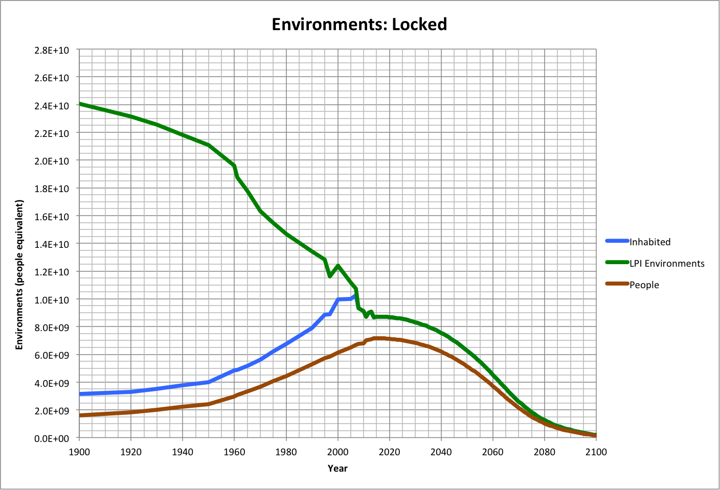 The Worst case scenario has population reaching a peak in 2015 and declining to zero by 2110. The following graph illustrates the near-term trajectories of these variables, normalized to their values in 1970 (about the time that the total ecological footprint last enabled other species to fully provide renewable ecological resources and have enough left for their own survival). |