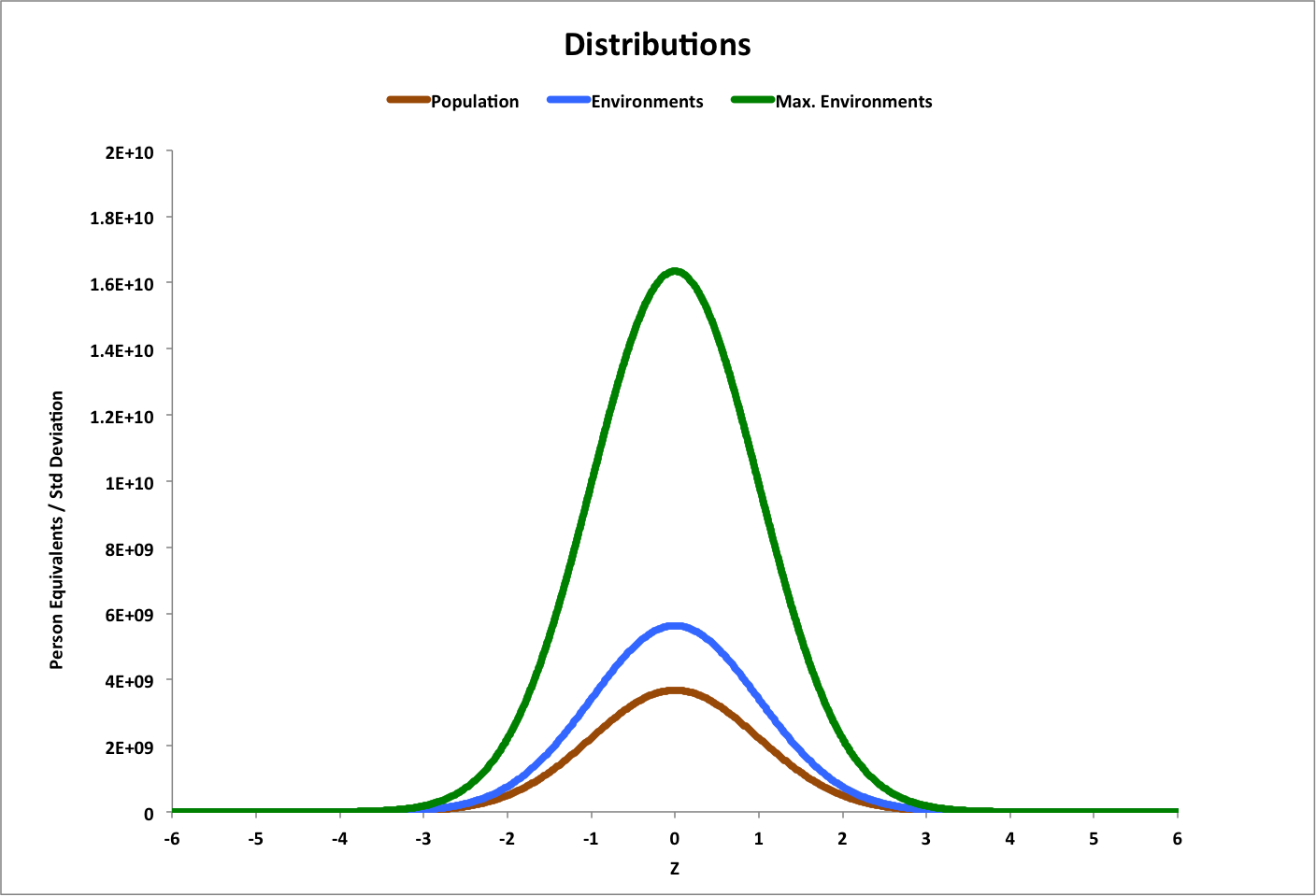 People and the environments they can inhabit are modeled as statistical distributions, each with their own population. They appear to be normal distributions. In the graph, Z is in sigma (standard deviations) centered on the people distribution, and population is the area under each curve. The environments we inhabit are part of a larger, maximum set of environments. As our population grows, the number of inhabited environments grows until it reaches the maximum number available. Over any given range of Z, the happiness (H) of the people (P) within it is the fraction of overlap between people and the environments (E) within the range:
